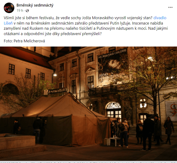 Představení Putin lyžuje jsme odehráli na Moravském náměstí v rámci festivalu Brněnský sedmnáctý, který připomíná události listopadů 39 a 89 a podněcuje občanskou společnost k aktivnímu zájmu o dění u nás i ve světě. Po představení jsme s pamětníky revoluce roku 1989 Janou Soukupovou (disidentka a novinářka) a Janem Špilarem (duchovní, kadeřník a aktivista) diskutovali o současné podobě demokracie, situaci v médiích i stavu společnosti.
