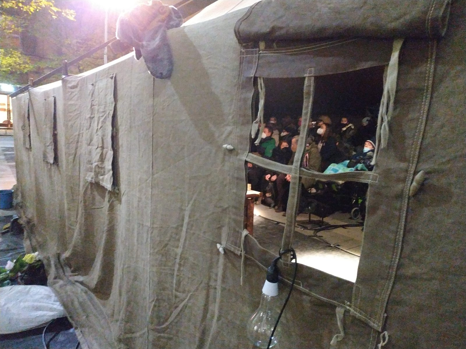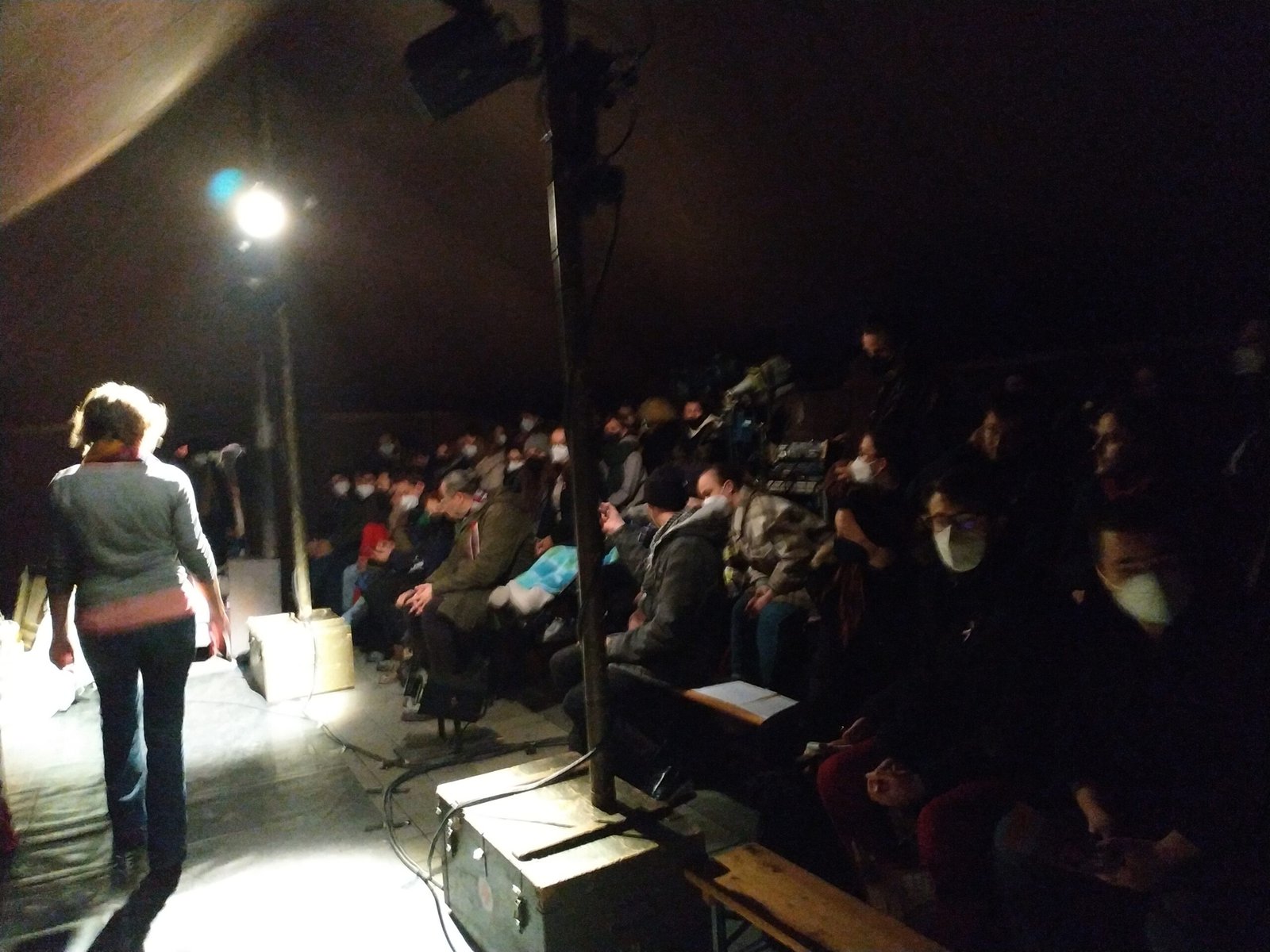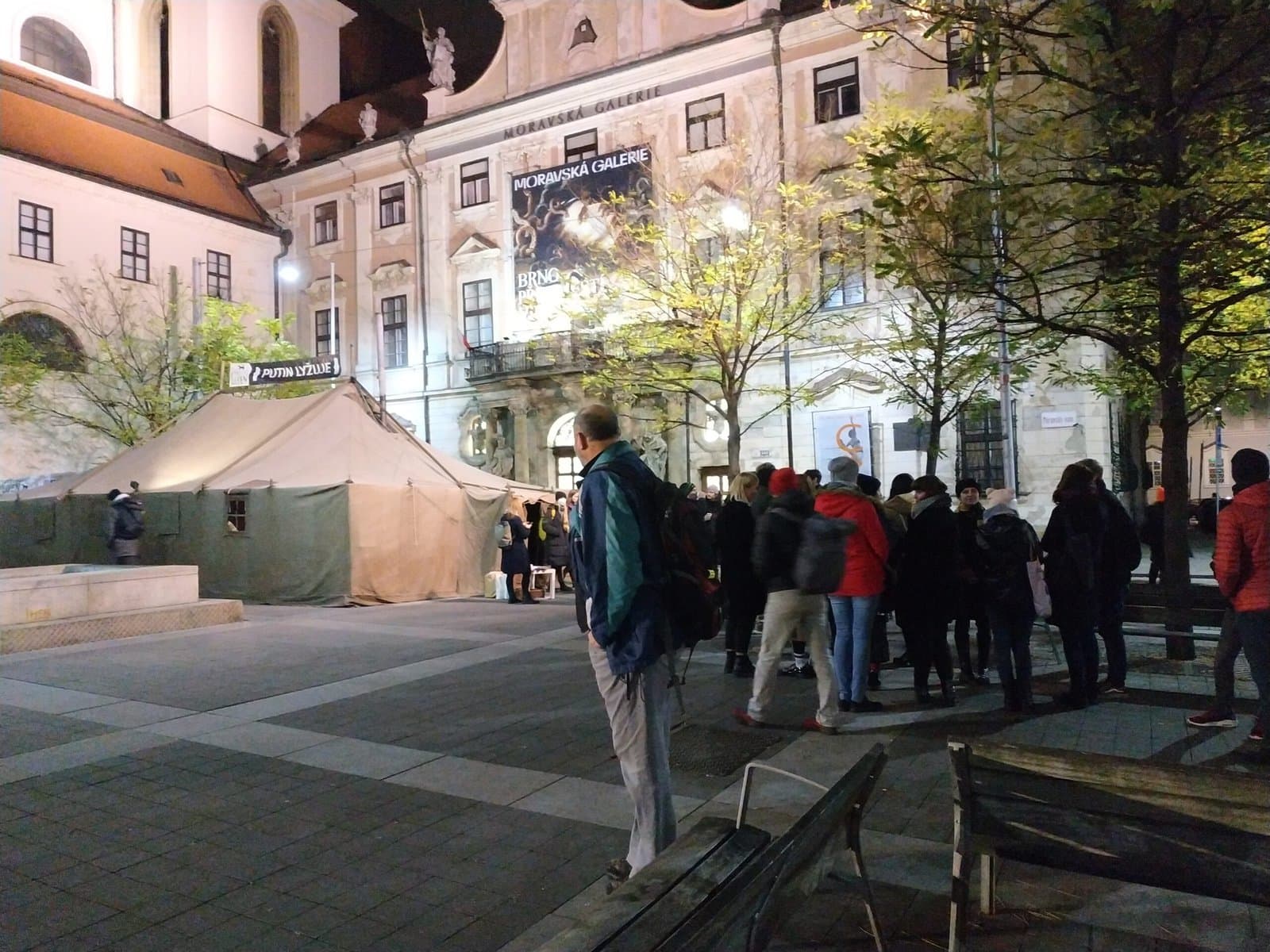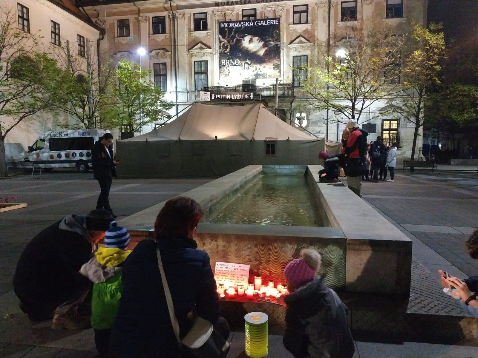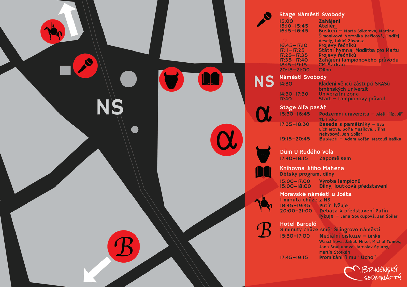 Představení Putin lyžuje jsme odehráli na Moravském náměstí v rámci festivalu Brněnský sedmnáctý, který připomíná události listopadů 39 a 89 a podněcuje občanskou společnost k aktivnímu zájmu o dění u nás i ve světě. Po představení jsme s pamětníky revoluce roku 1989 Janou Soukupovou (disidentka a novinářka) a Janem Špilarem (duchovní, kadeřník a aktivista) diskutovali o současné podobě demokracie, situaci v médiích i stavu společnosti.