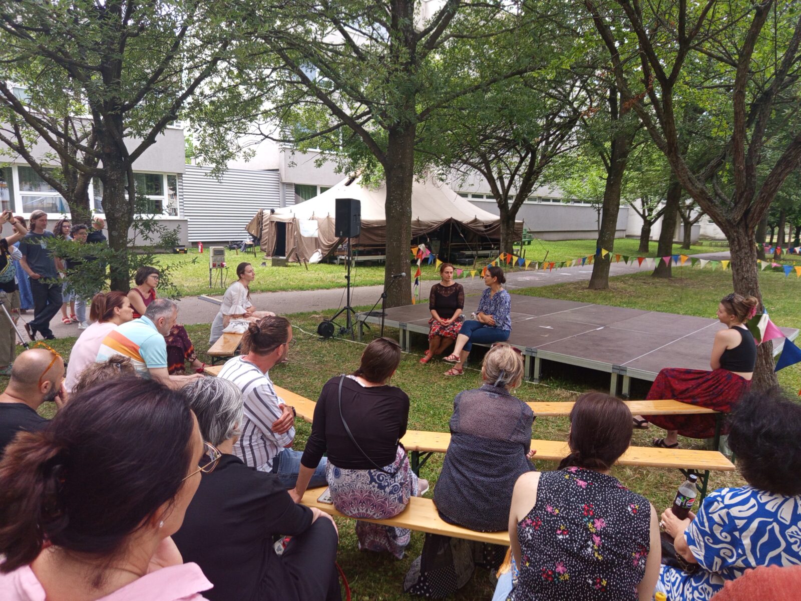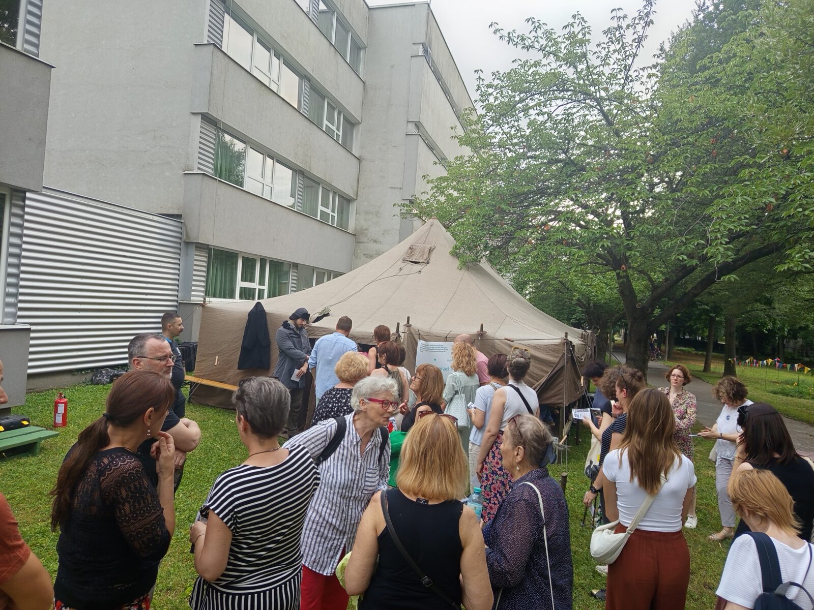 Divadlo Líšeň odehrálo hru Putin lyžuje s maďarskými titulky v parčíku vedle divadla a pak po představení debatovaly s publikem Pavla Dombrovská a Miladou Boráros.