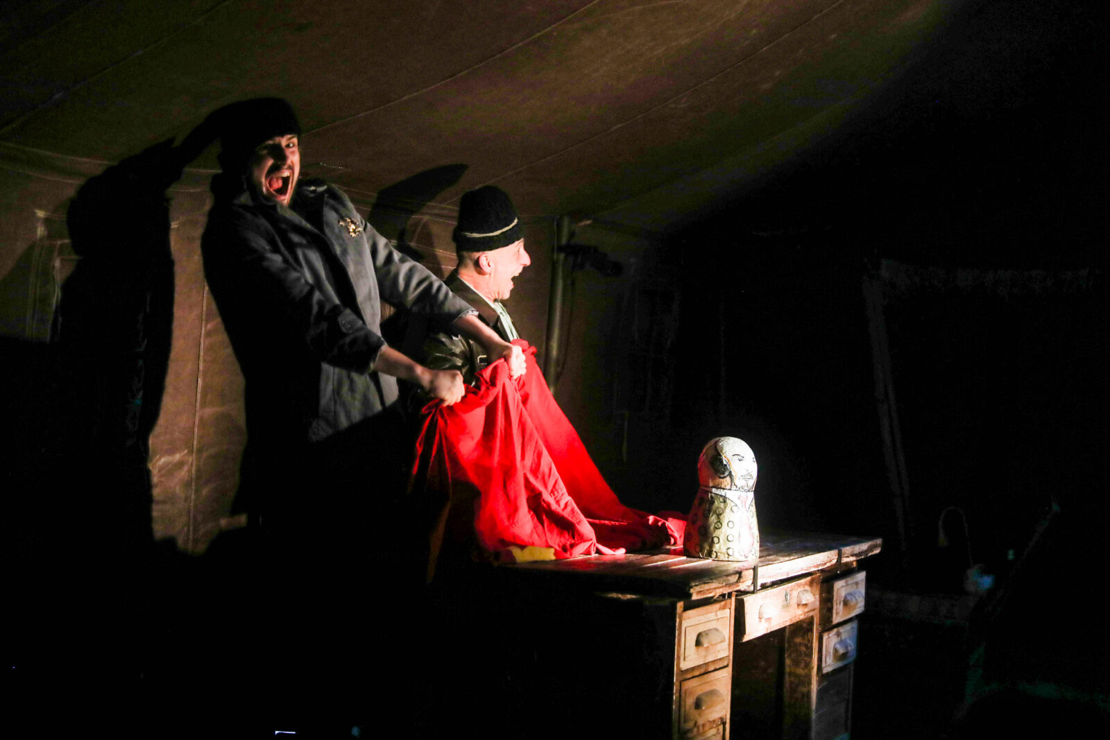 Čím víc se příběh noří do hloubky, tím víc ohromují kabaretní scénky, herectví a práce s loutkami i předměty. Pár příkladů: jak se stylizované plošné loutky (oběti) proměňují v medaile a připínají se na uniformu – a to výhradně na místo nad srdcem.; jak se prsty ruky mění ve funkční nohy – a pak náhle v pavoučí končetiny, které působí směšně i hrozivě; nebo jak se na konci z šuplíku stolu, odkud předtím vyběhl Putinův labrador, náhle objeví červená růže na památku obětí.