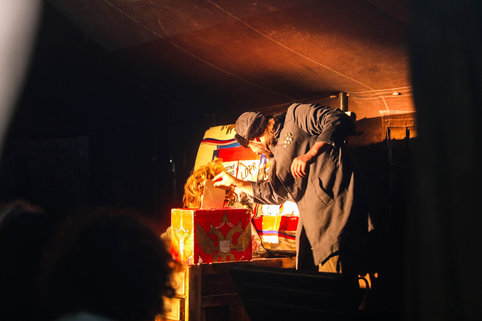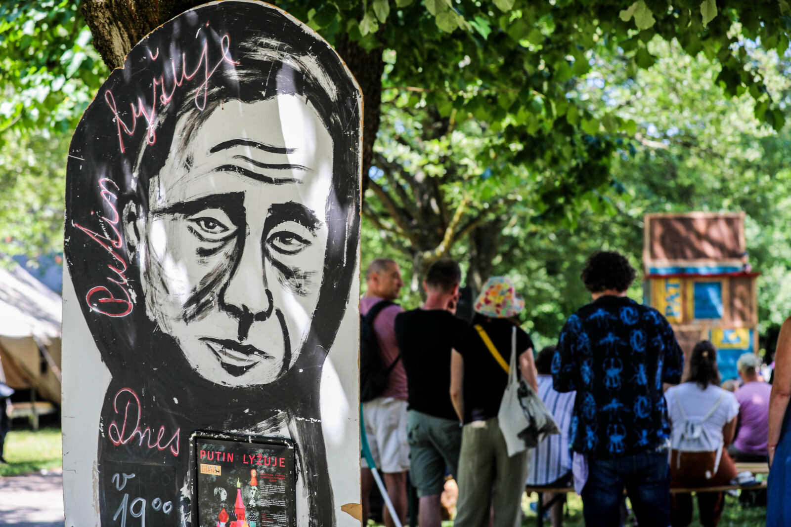 Večer v 19 hodin se konečně ukáže, k čemu slouží vojenský stan postavený na trávníku za festivalovou promenádou: hostí představení Putin lyžuje brněnského Divadla Líšeň. Tato inscenace pro dospělé, která v rámci projektu Provokující divadlo podpořeného Mezinárodním Visegrádským fondem putuje po zemích V4, zcela zaplnila improvizované hlediště z lavic pro 90–100 diváků. Bez problémů by se mohly odehrát dvě reprízy. Tento „bonus“ – hra s více postavami – uzavírá MonoBáb festival. Kata Csató, ředitelka loutkového divadla Mesebolt, se na závěr loučí s tím, že soubor je zván i na příští rok. Kdo letos představení nestihl, může doufat, že v roce 2026 se mu podaří ho vidět.