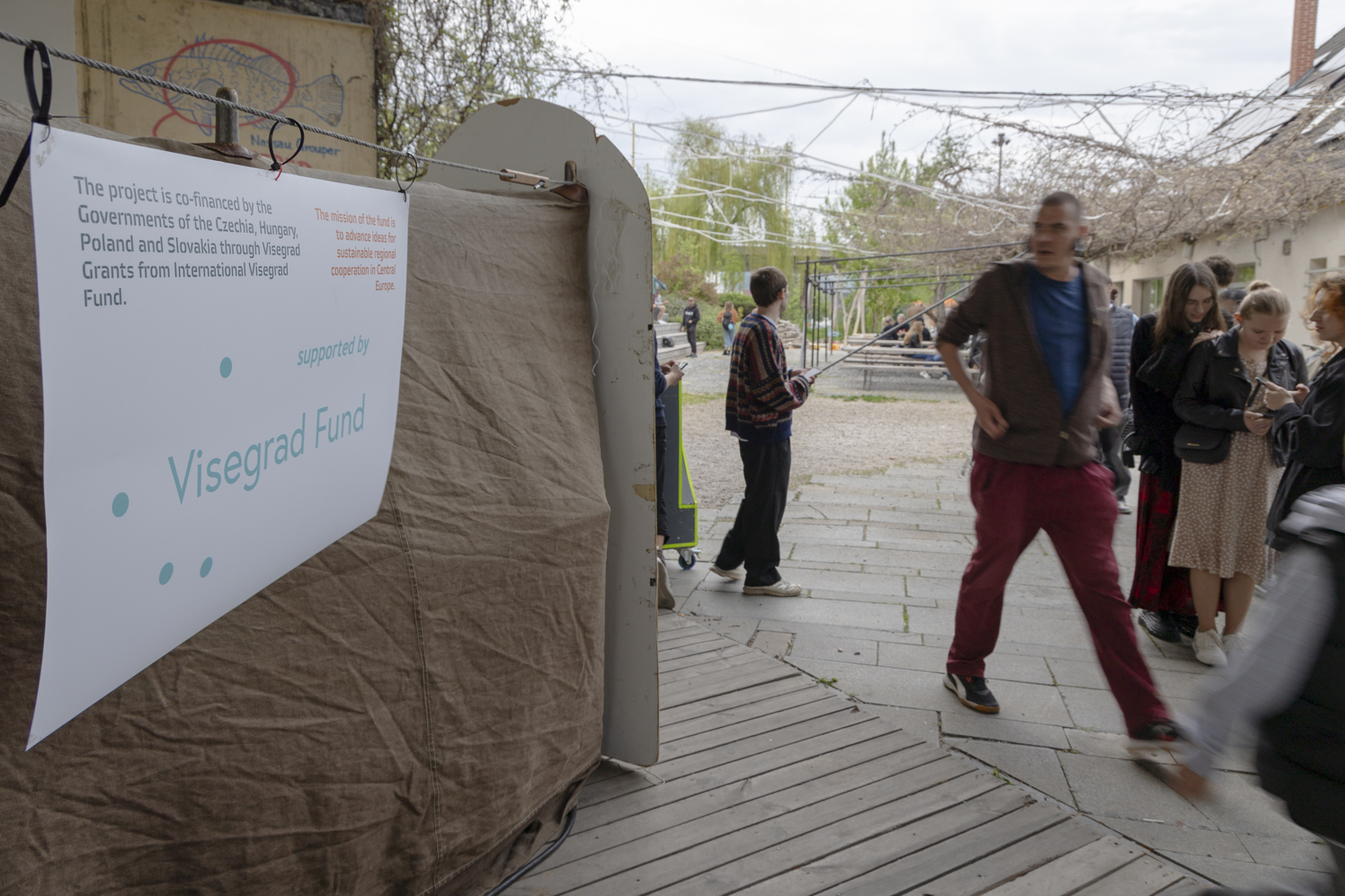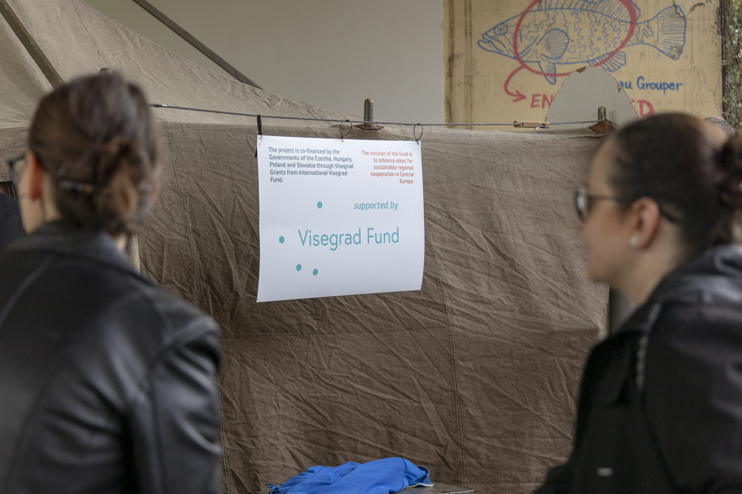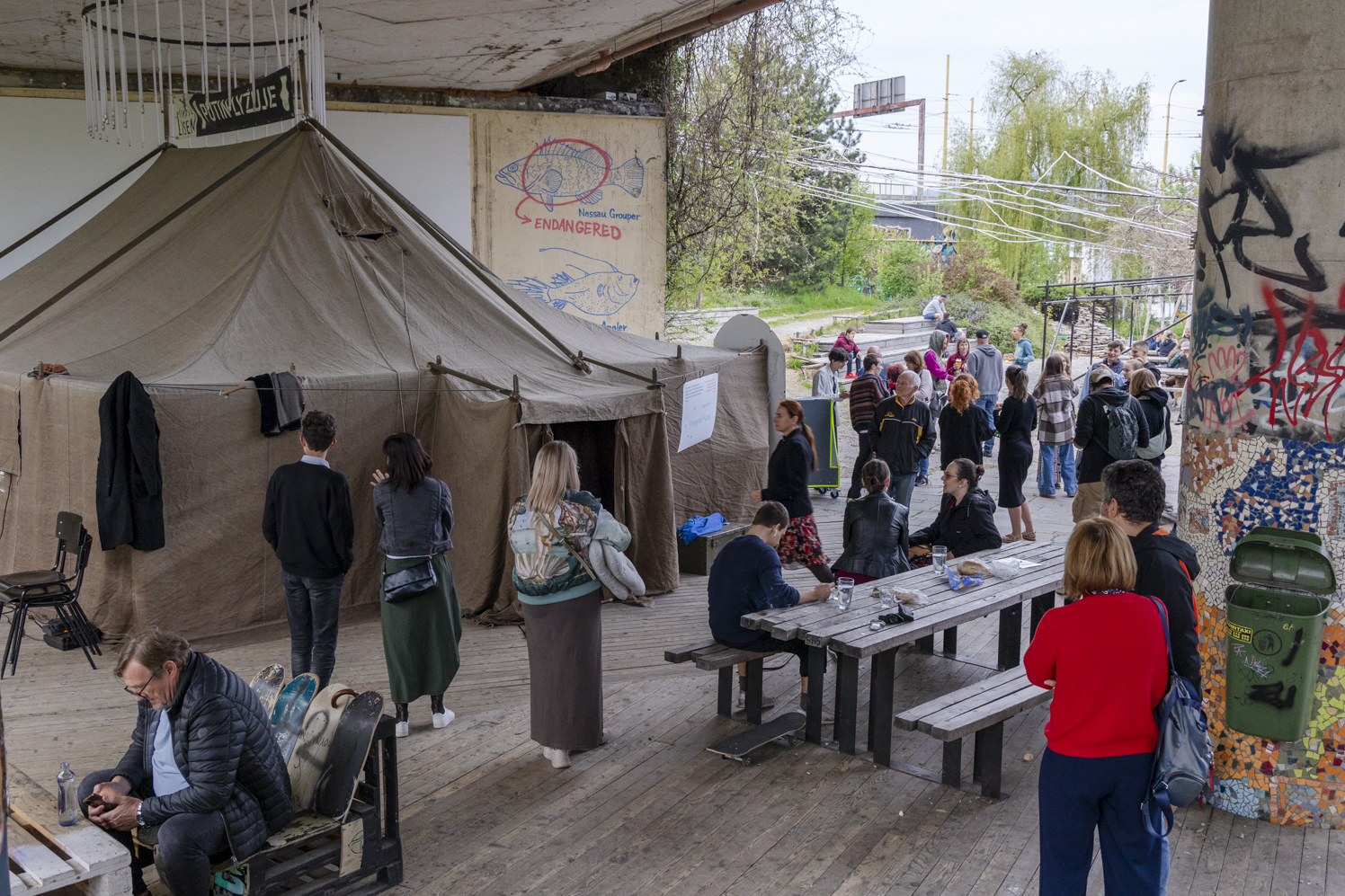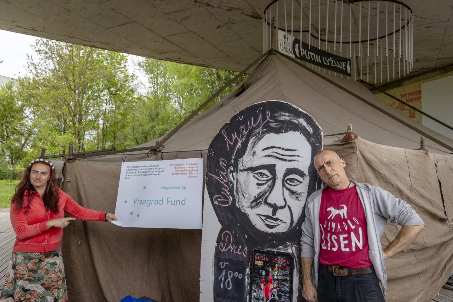 Představení s besedou se odehrálo ve vojeneském stanu venku pod mostem vedle kulturního centra Stanica – Žilina Zárečie.