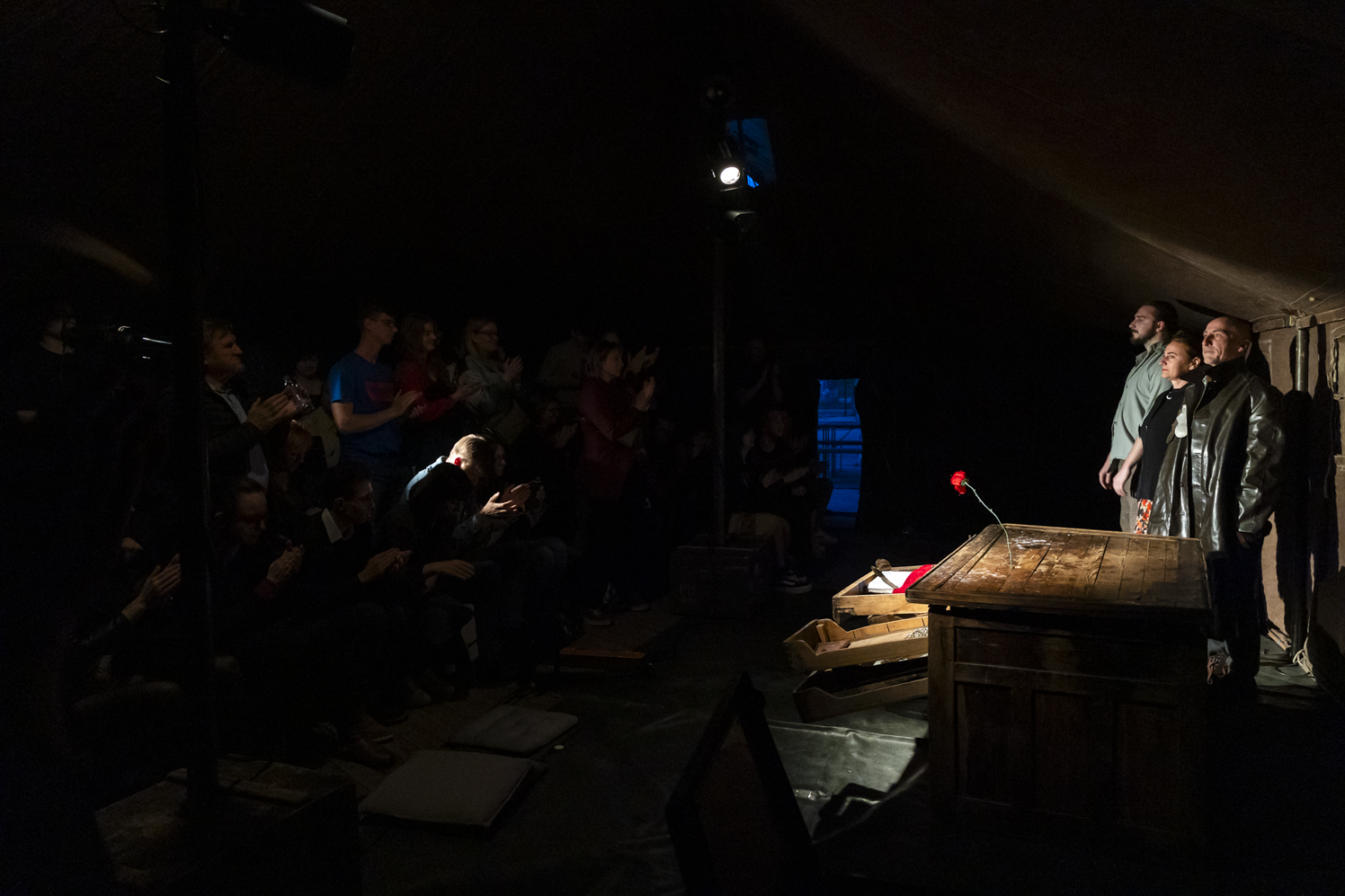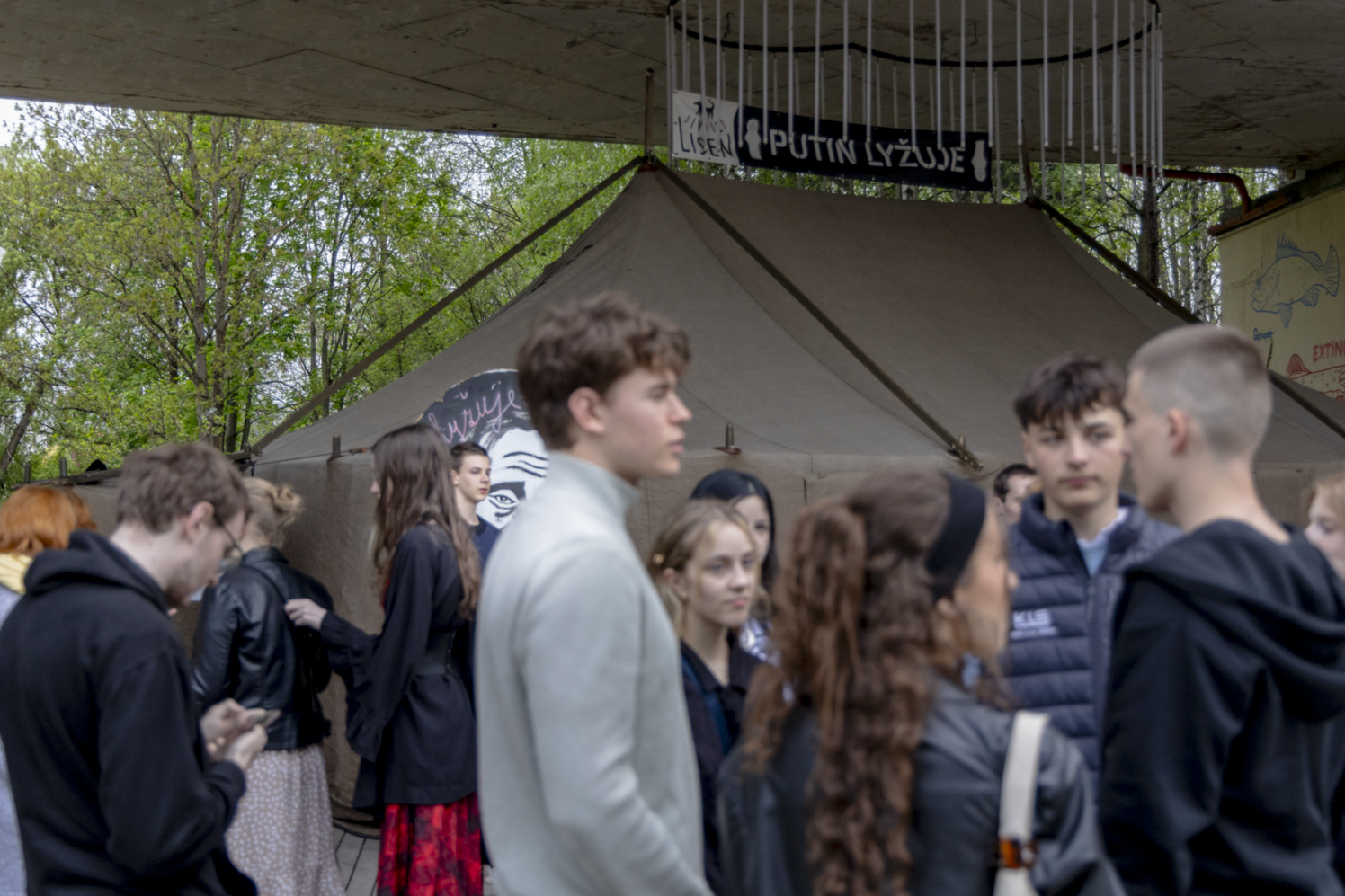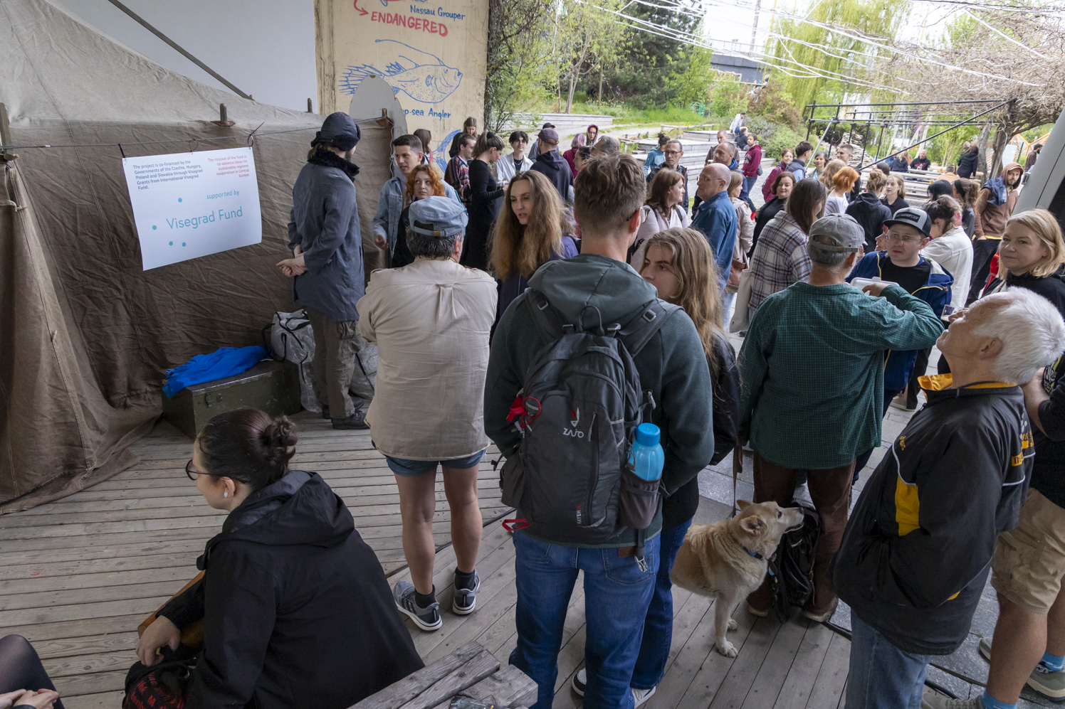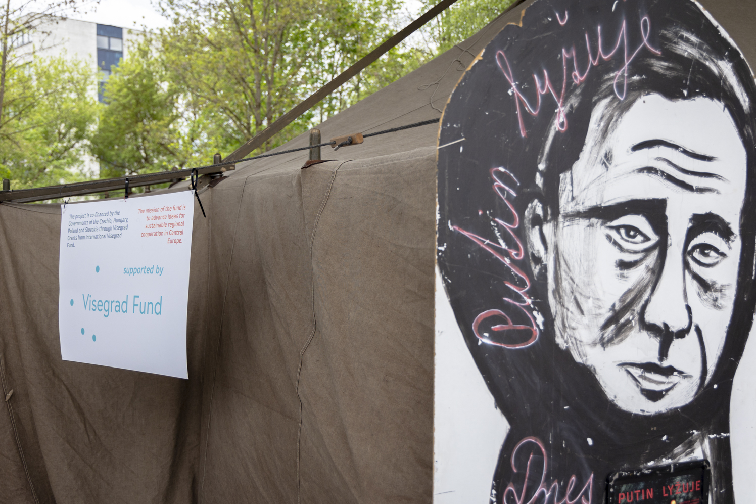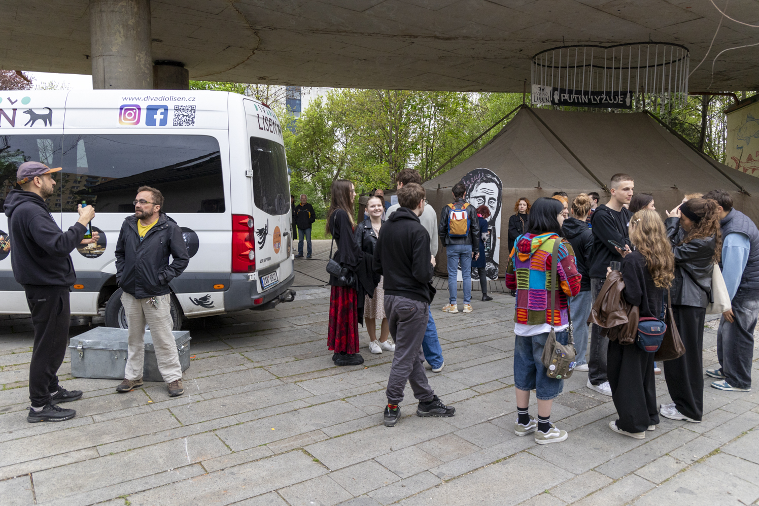 Představení s besedou se odehrálo ve vojeneském stanu venku pod mostem vedle kulturního centra Stanica – Žilina Zárečie.