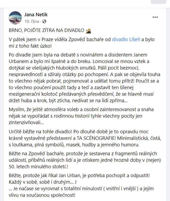 On October 8, the Prague premiere of the play Confession of a Jailor took place at the VILA Štvanice Theater, followed by a discussion with witness, dissident and journalist Jan Urban. The atmosphere of the evening was intensified by the holding of parliamentary elections and was best described by the viewer Jana: