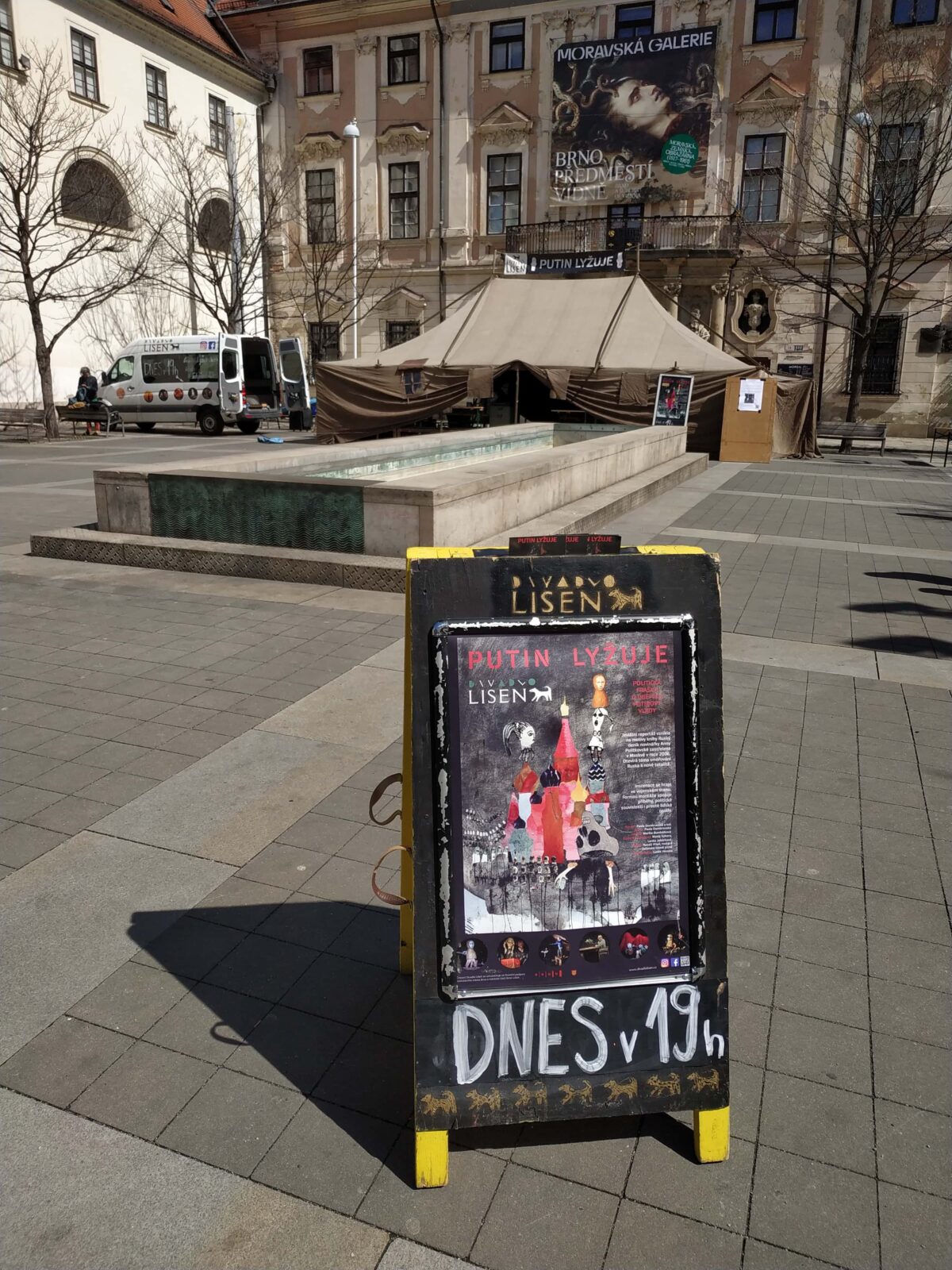 Wednesday, April 12, after the theatre performance Putin is skiing /a play about the birth of a killer/ on Moravské náměstí near the Jošt statue