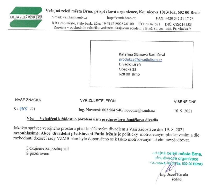 On the eve of the anniversary of the death of Anna Politkovskaya, from whose book The Russian Diary our play is based, we set up a theater tent on the piazzetta in front of the Janáček Theater. However, the implementation of the event was preceded by a surprising case with the Public Greens of the City of Brno, which rejected the performance on the grounds that it was a politically motivated event. Jana Ustohalová, an investigative journalist (and, coincidentally, our discussants), dealt with the case in detail in a report in Deník N. After media coverage, the VZMB commission dealt with the case again and reconsidered its decision.