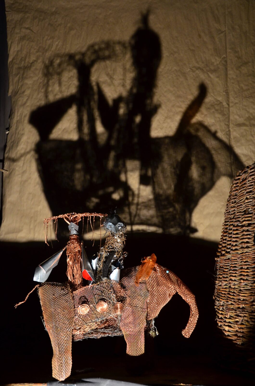 Divadelní odpočinutí od světového chaosu s křehkými kovovými loutkami, zvuky a stíny.